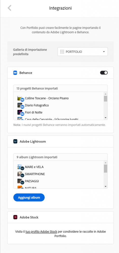 Come per Lightroom, Adobe Portfolio è integrato con Behance, il social di Adobe dedicato ai creativi. Anche in questo caso i contenuti su Behance potranno essere inseriti nel tuo Portfolio semplicemente premendo un pulsante.