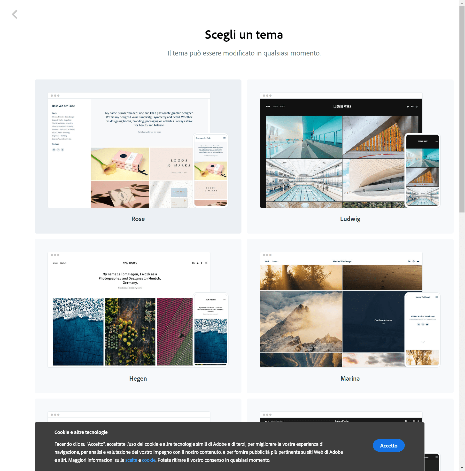 Grazie agli ottimi temi disponibili in Adobe Portfolio puoi realizzare il tuo Portfolio con un ’aspetto professionale, in linea con le tendenze del designer attuali, e applicabile con un semplice clic. Inoltre, i temi sono ottimizzati per la visibilità con qualsiasi dispositivo fisso o mobile.