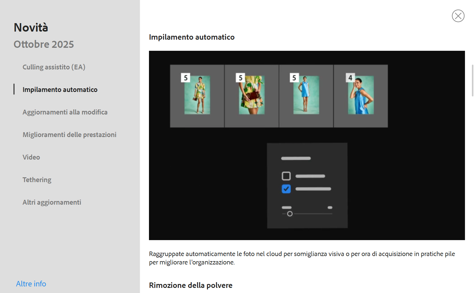 Funzionalità come Culling assistito, Assisted Clulling, (in accesso anticipato), oppure Impilamento automatico, Auto Stacking, aiutano il fotografo nella catalogazione delle foto, andando a ridurre i tempi necessari a svolgere questo compito.